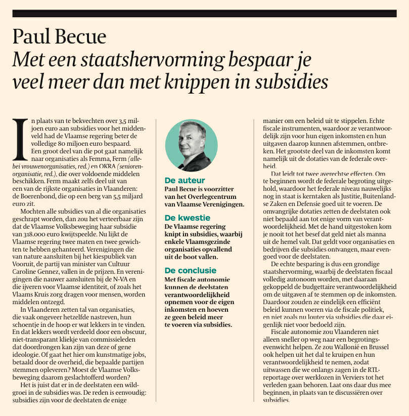 Paul Becue in De Tijd 21-11-2025: "Beter staatshervorming dan subsidies" Met fiscale autonomie kunnen de deelstaten verantwoordelijkheid opnemen voor de eigen inkomsten en hoeven ze geen beleid meer te voeren via subsidies.